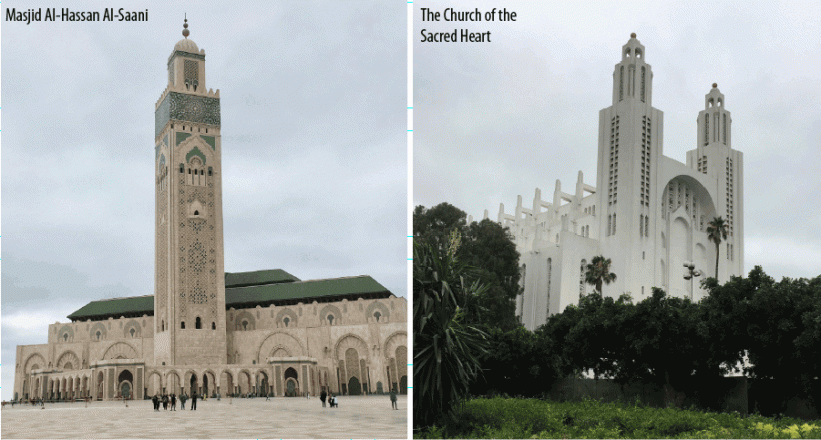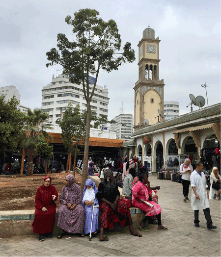 Casablanca, the port city and commercial hub, reminds you fleetingly of Karachi: a city without a distinct character of its own and its centre a mishmash of colonial buildings, bland offices and residential structures. What sets it apart from Karachi is its public squares surrounded by roadside cafes, street art and public transport system in place and, of course, its population which is around 4 million compared to Karachi’s 16 million! A 31-km tramway system, built in 2012, connects the east and western parts of the city with the centre. Shared taxis, kabira (big) and saghira (small), provide metered services. At kabira taxi stands, people queue up. We did not come across many buses. Probably the bus system is deficient. Though the French ruled Morocco only for 44 years (1912-1956), a colonial legacy persists: French, the second official language, is the language of economics and commerce, academia and the elite. The majority speaks Arabic.