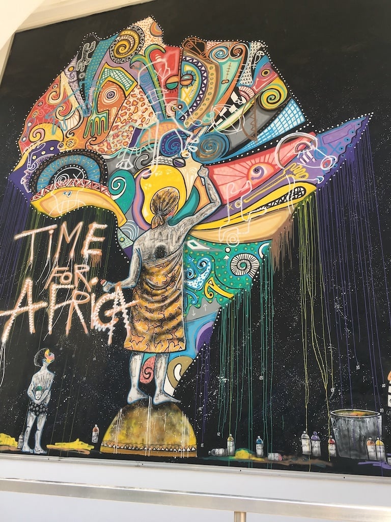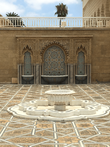 One of the features that I liked most about Rabat is the blend of traditional architectural elements with a modern use of interior space that many of its official buildings exhibit. The Museum of Modern and Contemporary Art, opened in 2014, is one such example. The outermost façade of the Museum is a white colonnade of double arches with latticework. Inside the arches is the chromatic façade displaying large reproductions of works or artistic announcements of exhibitions and events. A huge mural, Time for Africa, which showed a woman painting with vibrant colours the motifs of Africa as a child looks on, welcomed us as we entered the Museum which holds a permanent collection of Moroccan artists and curates local and international artworks. We wandered in several halls, had coffee in its café and bought an artist’s watercolour rendering of Rabat’s various sites in a handy book form.
