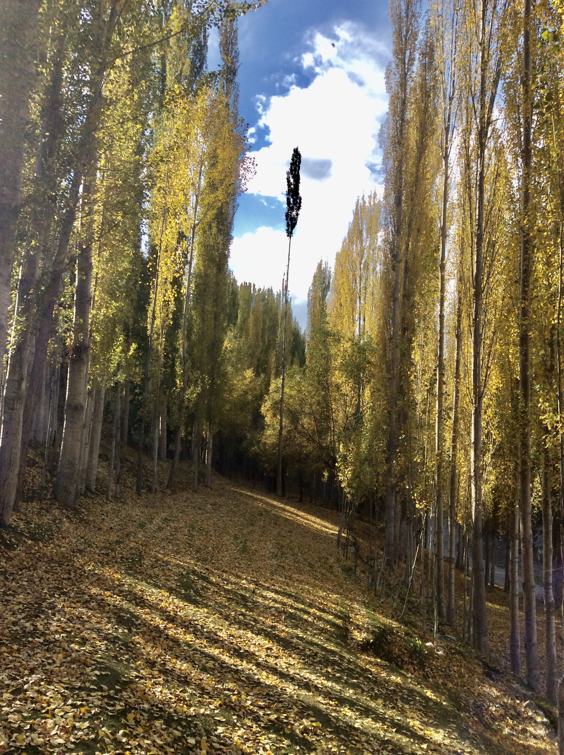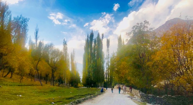On our way back, the driver dropped us at a sloping meadow lined with poplar trees and covered with yellow, crunchy, fallen leaves. It was a fascinating sight but the ground was wet, muddy and dangerously slippery from stream waters trickling down the slope. We took pictures and strolled down cautiously wondering at the mountain people who navigate the terrain with agility and dignity. We got on the car and made way to Gilgit city for the last night stay to catch our flight in the morning.