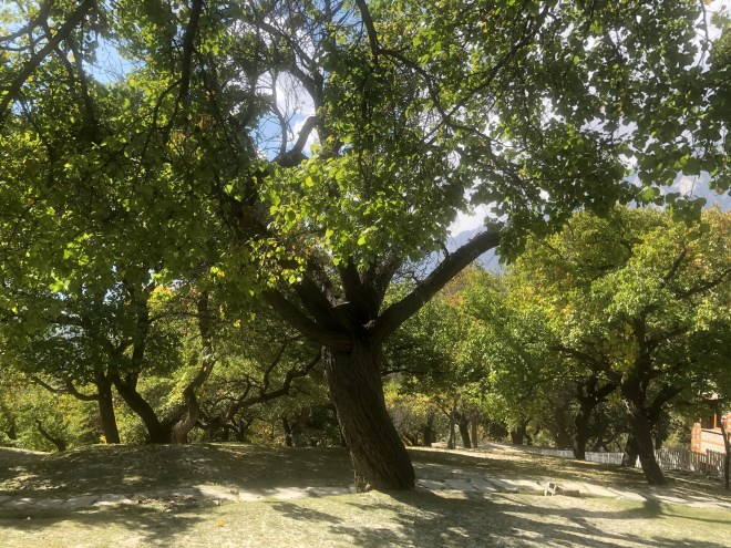 Next in our sojourn was Ganish village, a 1000 years old settlement in Hunza valley. We got down near the boys’ school and were told by a villager that the guide is inside. We entered through the ancient gate. On the right was the Jamaat Khana or Imam Bargah, originally built in 1922 and extended in 2002. At the centre was a large ancestral water pond shaded by an old chinar and willow trees. An elderly man, the tour guide donning an olive waistcoat, asked us to follow him inside the settlement. The village courtyard had a peaceful ambience and on the raised platforms by the sides old women sat serenely. Crossing the narrow alleyways by the ancient watch towers, we reached another open space surrounded by wooden structures on pillars with intricate carvings. Along with another family of tourists, we listened to the story of the historical place from the guide, Shabbir. This traditional communal space is still used by the villagers for gatherings and celebrations.