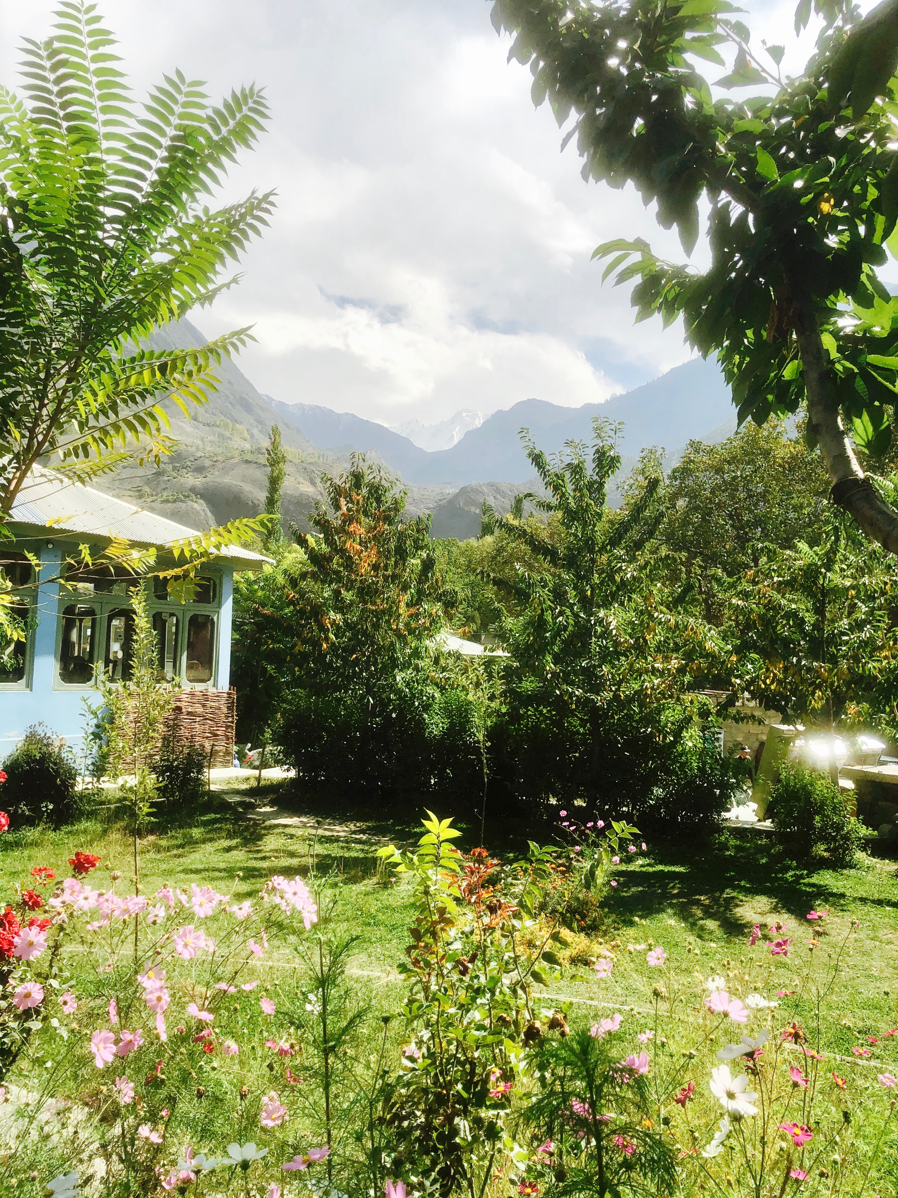 The guide left us on a terrace of the fort to enjoy the view of the valley. It took us a while to locate the right chamber to exit the fort! We then headed to the Kha Basi Café set in a corner of the garden surrounding the fort. Once a winter residence of the ruling Mirs, it is now a restaurant run by all-women local team—manager, accountant, chef and waitresses under Serena Hotels. We sat on the terrace on a traditional dining platform covered with rugs and gao-takyea to recline. One terrace below, workers were busy finalising a row of cottages being newly built by the Serena Hotels.