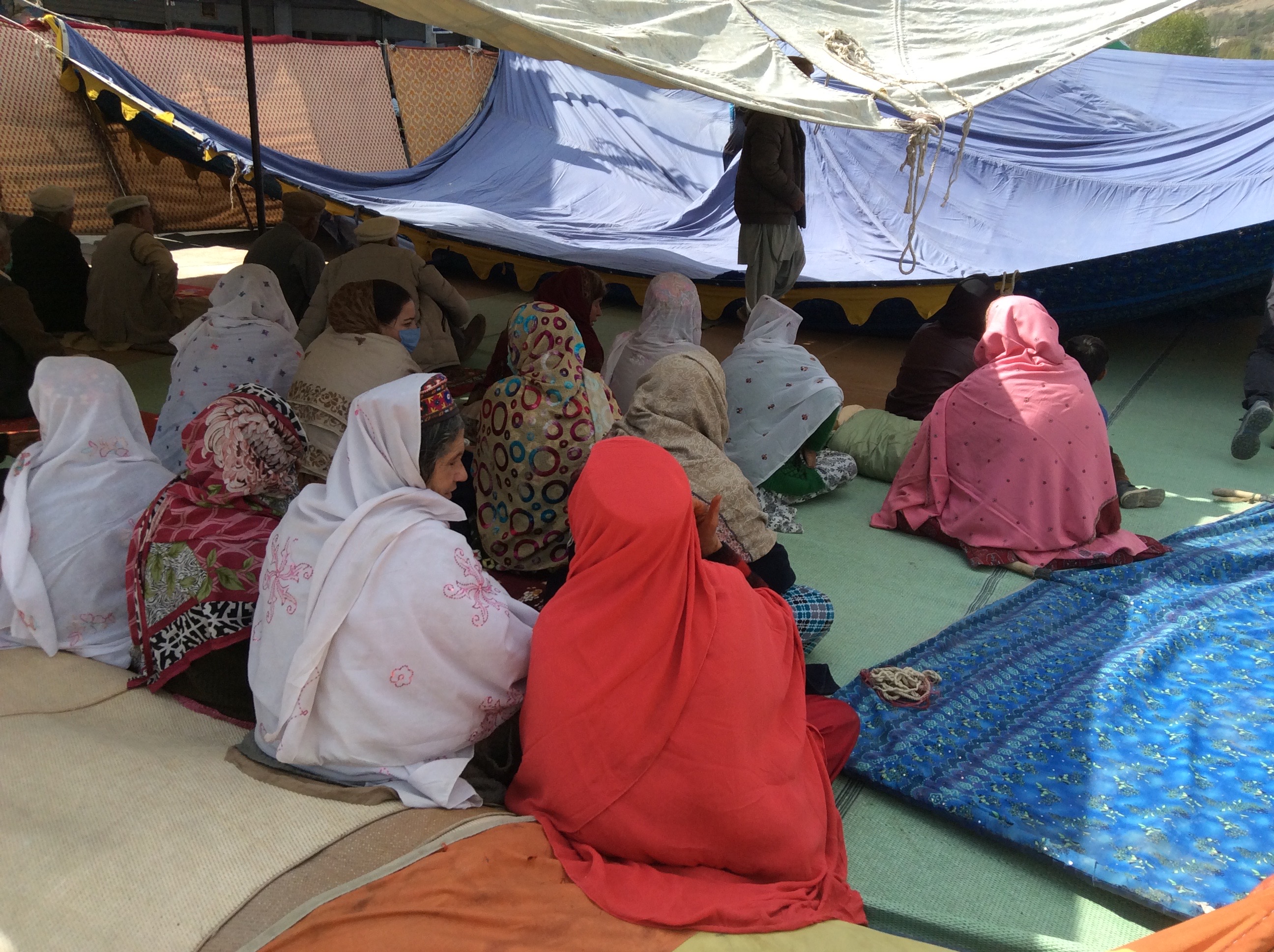 The commercial hub and administrative headquarters of Hunza district, Ali Abad town is located in a wide valley. Known for gems–ruby, sapphire, spinel, mined from nearby rocks—Ali Abad was bustling with a sombre activity when we reached dharna site in the middle of the Karakoram Highway on 9 October 2020. Inside the tent women—mothers, wives and sisters of wrongly imprisoned men–sat silently, many wearing face masks. Men were standing outside in groups and an activist was addressing the people through a loudspeaker.