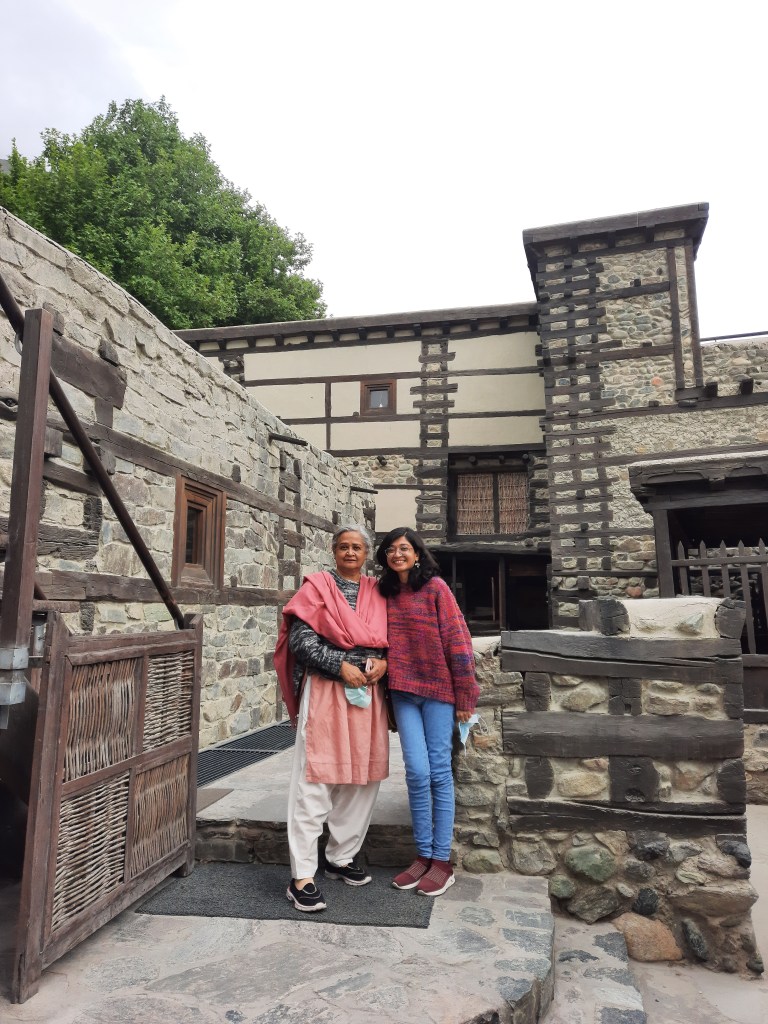 Shahid, in his 20s, fluent in Urdu, had earned a Master’s degree in economics from Karakoram International University and ran a dry fruit dhaba-cum-chai khana. We went into his shop, bought some dry fruit and asked him what was worth visiting in the village. He told us of an old khanqah and a mosque. ‘Can we walk?’ I asked him. ‘Yes, it is close by, if you go straight on this road, you will find it on your right’, he gestured to a faraway direction. When I enquired about transport availability, he said his father had got one. We sipped the tumoro chai made of wild thyme in his dhaba with a view of the stream and the poplar trees lining up the embankment. His father came in his Toyota Prado and let Shahid drive us to the old mosque and the khanqah.