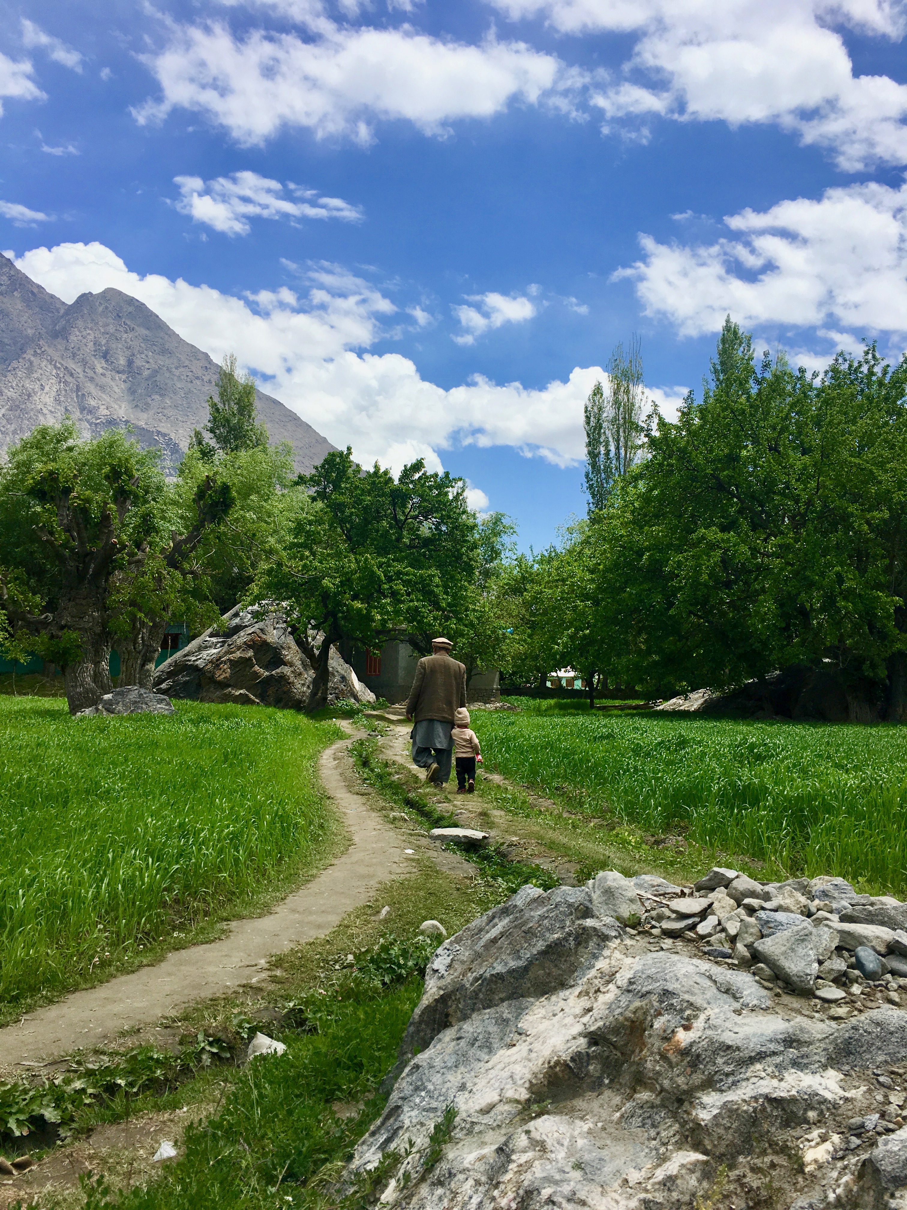 From upper Kachura lake, Ali drove down a narrow, deserted, pebbly dirt road that led to Soq Nullah, a short cut that bypassed the village in the Soq Valley. We stopped by a wooden bridge hanging over the gushing stream that flowed down the boulders and rocks. A group of local young men were crossing the bridge. I stayed on the swaying bridge while my daughter got down on the rocks to dip her feet in the cold stream water. After breathing in the panoramic view, we went back to board the Prado. On the way we saw a few children playing and an old man walking slowly and then stopping to catch a glimpse of the passing vehicles and the outsiders. The road finally ended at a clearing by the stream. Placid and shrivelled, the stream, Soq Nullah, flowed calmly. The arid mountain range, the trees and the green fields at the edges gave the valley a haunting aura.