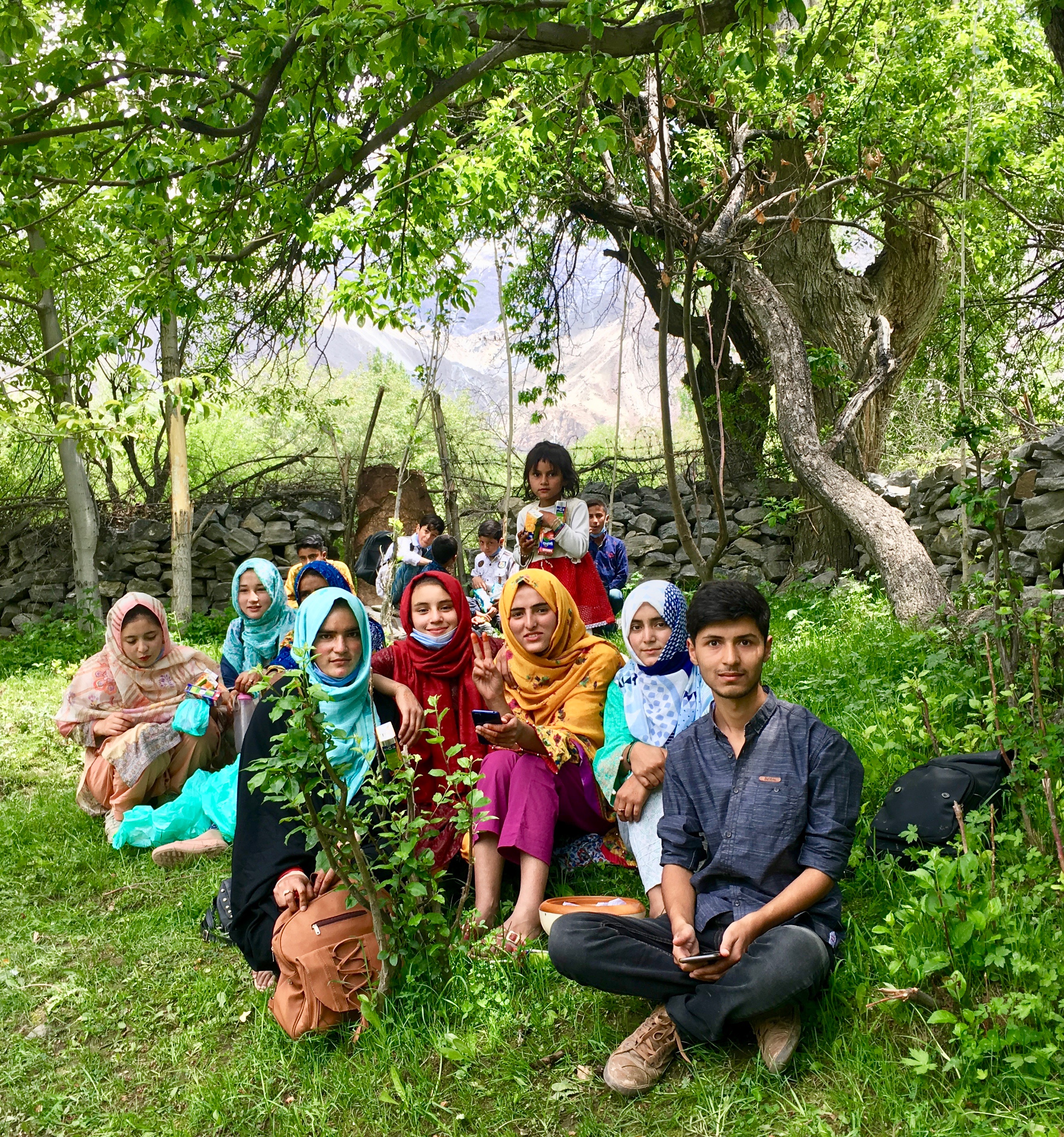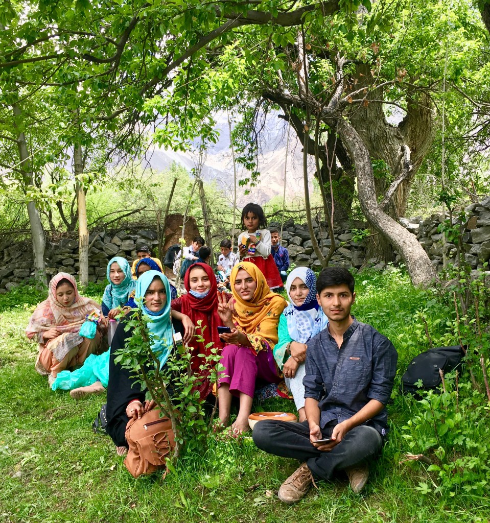 We got down at the other side of the lake, a quiet, deserted spot with rocks and sandy bank. While I rested under the shade of a massive rock, my daughter climbed up to have a panoramic view. A group of young men at a faraway spot beckoned the boatman. Their voices echoed in the valley. Manzoor sped up the boat to bring the boys ashore and returned to take us back. The climb-up towards the car was tiring for me and we sat down to sip the herbal tea we had come to relish. While descending, we passed by a group of Skardu city girls in head scarfs, a boy, probably their cousin, and a few kids, resting under a shady tree, a few looking at their mobiles, probably at the pictures taken during excursion.