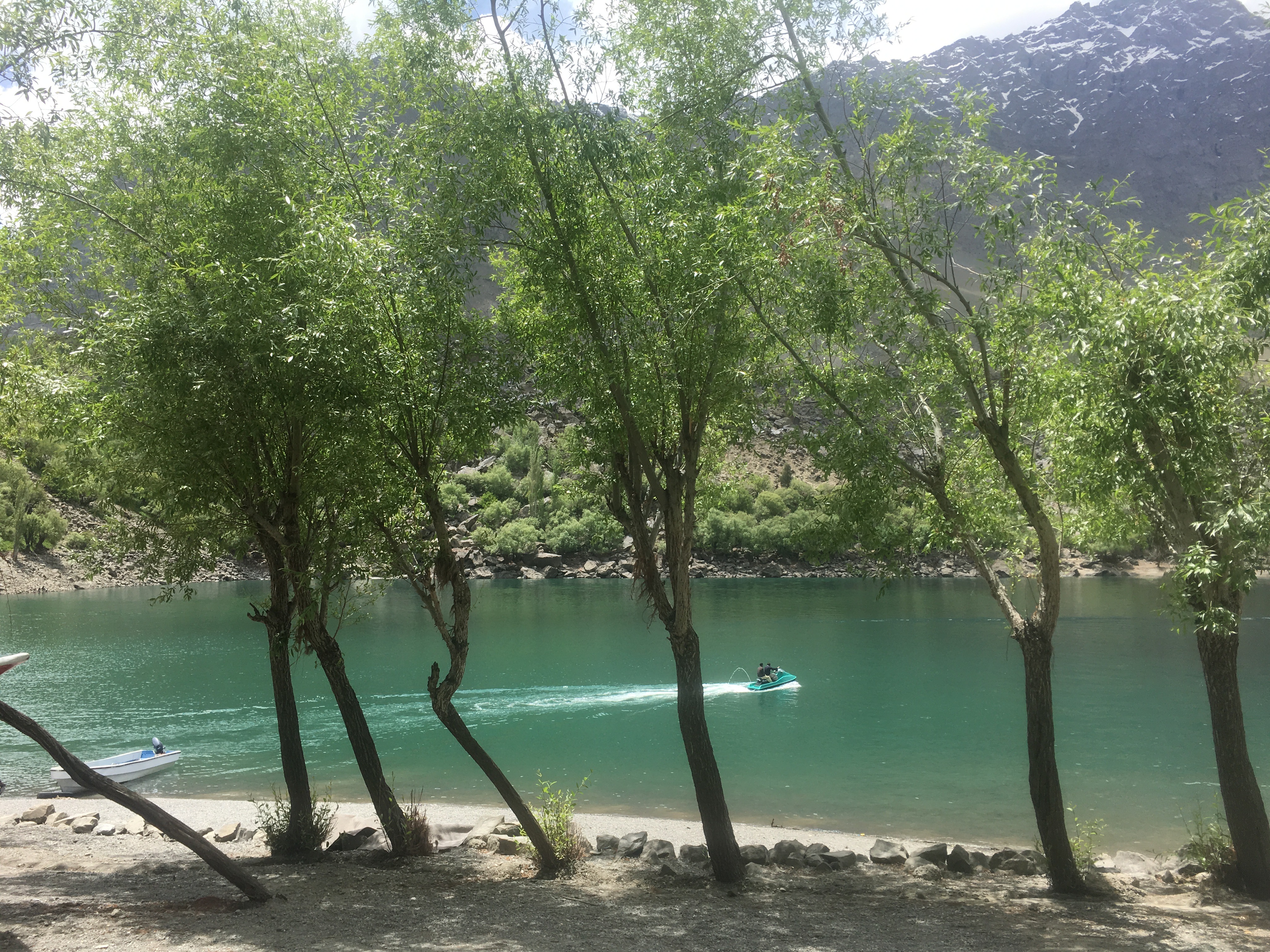 The fascinating ride to upper Kachura Lake came to an end and the driver stopped at a clearing surrounded by sloping forest and a rough terrain. From that spot we walked up and then down the rugged pathway for about twenty minutes. As we descended the slippery slope, there emerged a beautiful emerald green lake, edged by the Himalayan range, conifer and apricot trees, and a row of swaying trees at the embankment. A few orange-coloured boats rocked gently at the bank while the boatmen and locals sat on the pebbly shore. There was just a couple of man-made structures at the far end slope facing the lake. All else was pure pristine nature!