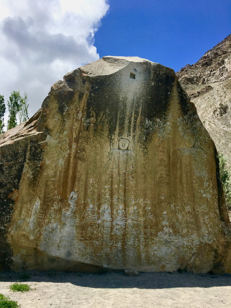 A massive granite rock, located in Manthal village towards the south of Skardu city, the Manthal Buddha Rock is famous for its ancient Buddha relief. An insignificant gate and a boundary wall have been put up along with a tuck shop which operates as a ticket booth. Our guide told us the rock was unprotected until recently, and was being vandalised, so the officials asked a local young man to run a tuck shop, charge entry fee and keep an eye on the historical site. We found the rock in a pretty bad shape due to wear and tear of time, weather and human mischief. Turned yellow at the lower half, the relief is defaced with wall chalking. Still, the carving of the meditating Buddha in the centre, two standing Metreyias (future Buddhas), surrounded by small Bodhisattvas sitting in rows at the top, bottom and the two sides of the meditating Buddha are clearly visible. On the side of the rock you find inscriptions in Tibetan language. According to the historians, the relief was created during the ‘Golden Era of Buddhism’ in the upper Indus valley between the 8th and 10th centuries. Representation of the Council of Buddha was said to be a way of disseminating the Buddhist teachings. I wish the officials would have done a better job in protecting this ancient Buddhist monument.